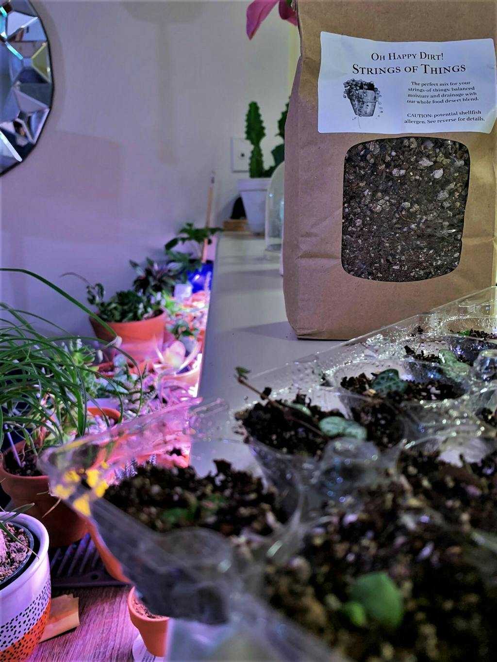 • Senecio varieties (Senecio rowleyanus/string of pearls, S. peregrinus/string of dolphins, Curio radicans/string of bananas, etc)